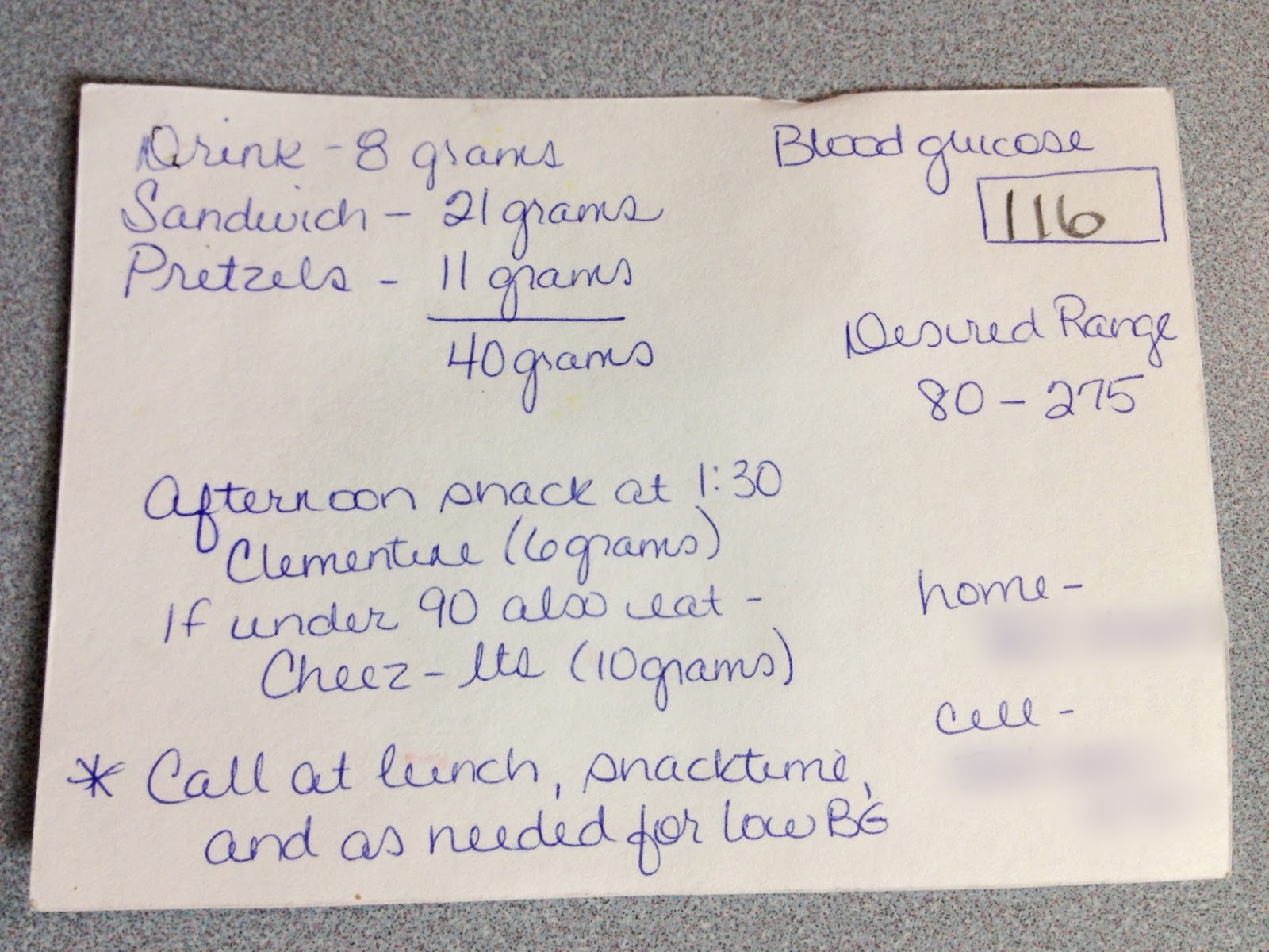 Our new little note card system has worked very well for us so far! She's been happy to have all the carbs counted out and added for her so that as long as she eats everything she can quickly "do her insulin" and get out to the playground! And I think she enjoys having her "note" from mom (despite what it's all about)...she never knows what kooky way I'll describe the day (marvelous monday, wacky wednesday, etc) or what silly message I might include other than the standard "call me".